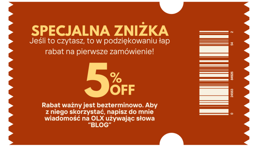 No ale jak użyć tego rabatu? Jeśli masz już kod np. „blog” to napisz do mnie wiadomość prywatną, z informacją co chcesz kupić. Edytuję ogłoszenie i zmienię w nim cenę. Kody zniżkowe możesz znaleźć w różnych miejscach. Czasami przemycę je w jakimś wpisie na stronie, czasami w mailu z newslettera, albo na ulotce czy paragonie.